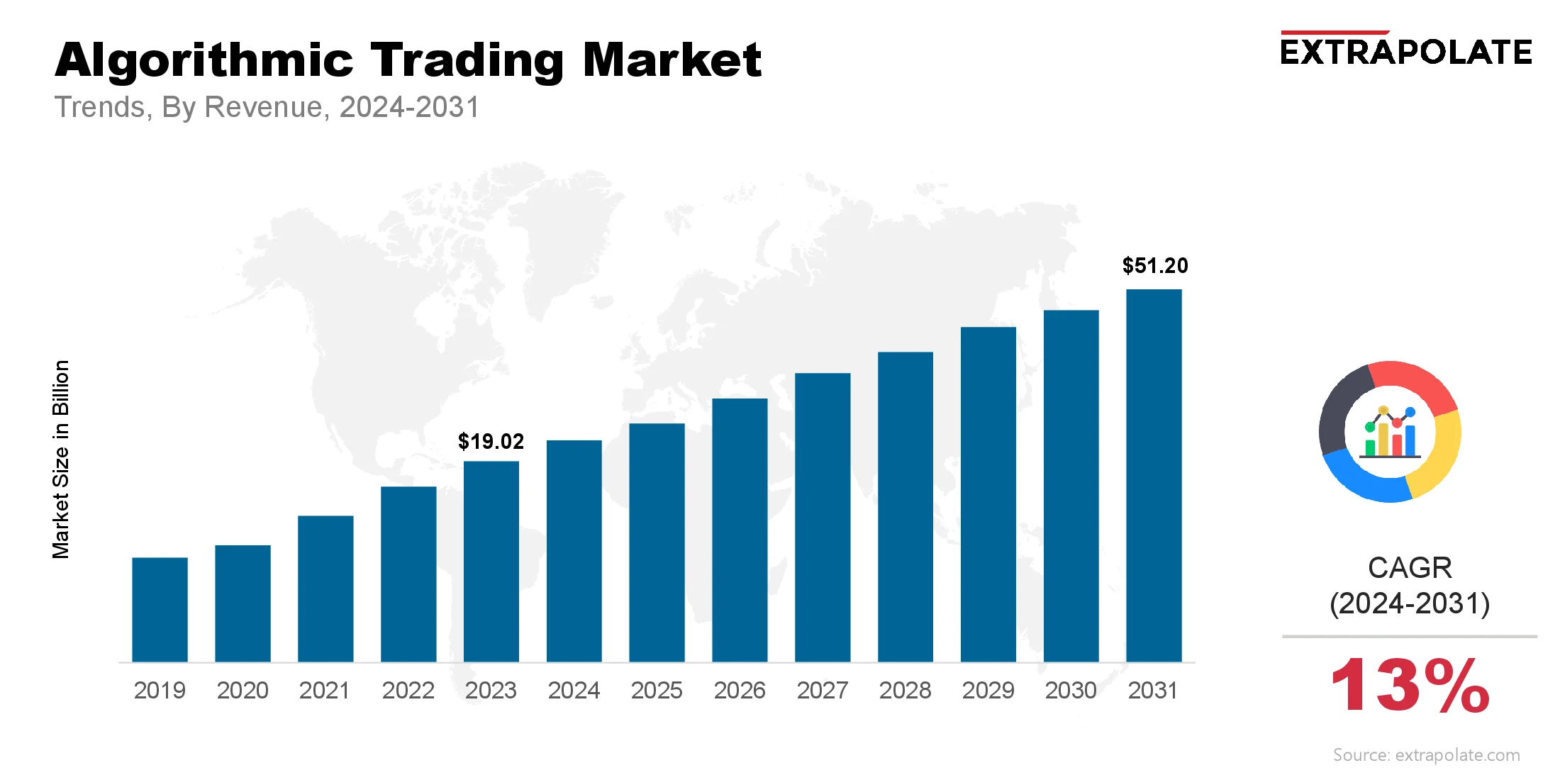 The global algorithmic trading market size was valued at USD 19.02 billion in 2023 and is projected to grow from USD 21.69 billion in 2024 to USD 51.20 billion by 2031, exhibiting a CAGR of 13% during the forecast period.