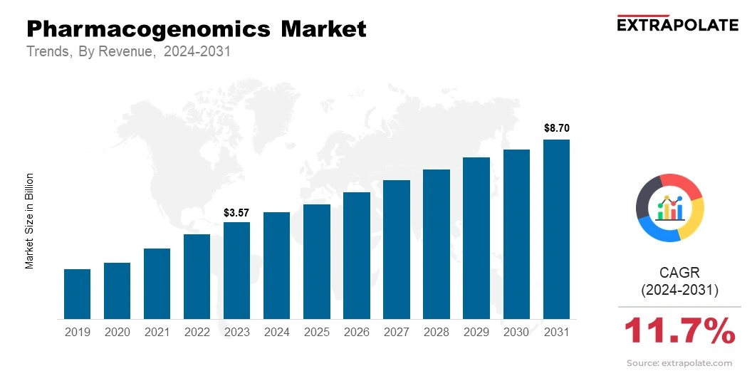 The global Pharmacogenomics Market size was valued at USD 3.57 billion in 2023 and is projected to grow from USD 4.02 billion in 2024 to USD 8.70 billion by 2031, exhibiting a CAGR of 11.7% during the forecast period.