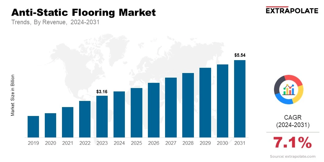 Глобальный размер рынка антистатического пола был оценен в 3,16 млрд долларов США в 2023 году и, по прогнозам, будет расти с 3,42 миллиарда долларов США в 2024 году до 5,54 млрд долларов США к 2031 году, что показало среднегодовое значение в 7,1% в течение прогнозируемого периода.
