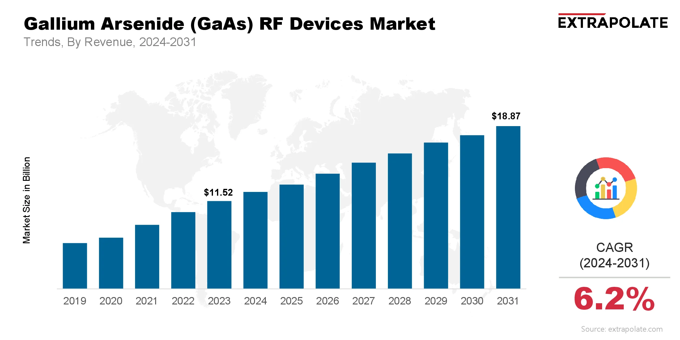 The global Gallium Arsenide (GaAs) RF Devices market size was valued at USD 11.52 billion in 2023 and is projected to grow from USD 12.34 billion in 2024 to USD 18.87 billion by 2031, exhibiting a CAGR of 6.2% during the forecast period.
